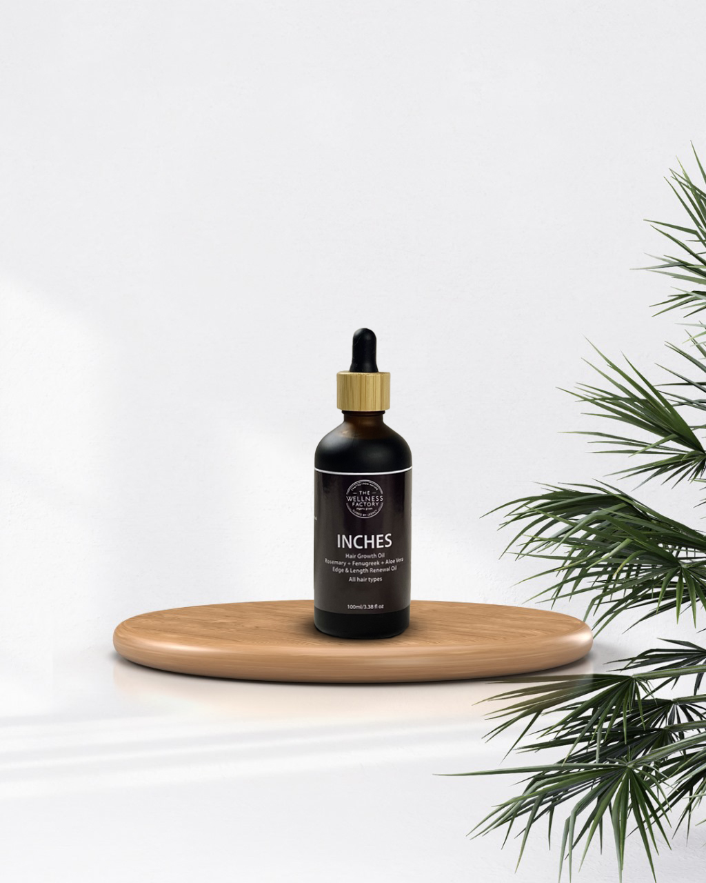 Grow your crown with intention. INCHES by THE WELLNESS FACTORY is a powerful herbal-infused hair oil designed to stimulate growth, strengthen strands, and restore scalp health from within.